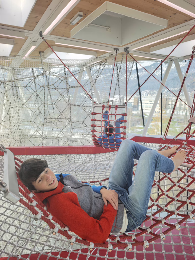 Die Kinder zieht es natürlich ziemlich schnell zum Spielturm. Hier heißt es Schuhe aus und Anti-Rutschsocken anziehen – du kannst eigene mitbringen oder direkt vor Ort ein Paar kaufen. Über vier Ebenen geht es im Spielturm nach oben. Aus Sicherheitsgründen sind einige Bereiche für Kinder unter einer bestimmten Körpergröße oder einem bestimmten Alter gesperrt. Das Kletternetz, das sich über alle vier Etagen zieht, ist beispielsweise für die Kleinsten zu gefährlich. Trotzdem ist für jedes Alter etwas dabei: Balancieren auf den Holzbalken im Niedrigseilgarten, Rutschen in der Röhrenrutsche von einem Stockwerk ins nächste, Hüpfen auf den Trampolinen oder das Besteigen des rutschigen Holzhügels. Schaukelliegen, kleine Verstecke sowie Schiebepuzzle und Tiermemorys an den Wänden sorgen für jede Menge Abwechslung und Spielspaß.
