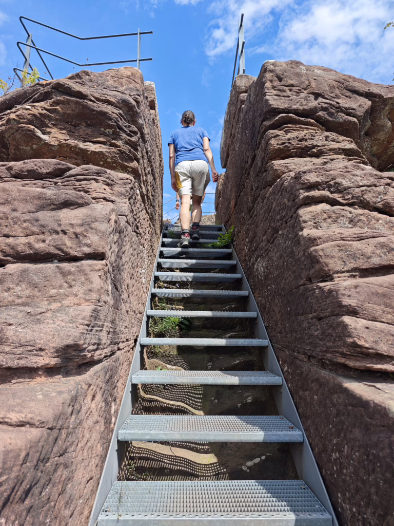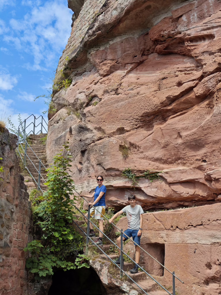 Heute sind noch viele Mauern, Gänge, Zisternen, Kammern und Aufstiege der Burg erhalten. Mit Kindern ist es spannend, die gesamte Anlage zu erkunden. Hinter jeder Ecke wartet eine neue Treppe oder ein Aufgang, der natürlich sofort erklommen werden muss. Grafendahn und Alt-Dahn sind fast ganz zusammenhängend. Überall auf der Burg gibt es tolle Aussichtspunkte und man kann weit über die Landschaft schauen. Viele Gänge und Zimmer sind direkt in den Felsen gehauen. Nimm dir ausreichend Zeit, um die Burg zu entdecken – wir waren knapp eineinhalb Stunden dort. Parken kannst du unterhalb der Burg, allerdings gibt es nicht allzu viele Parkplätze (hier auf der Google Karte). Tagsüber von 10:00 – 17:00 Uhr sind die Burgen kostenlos zugänglich.