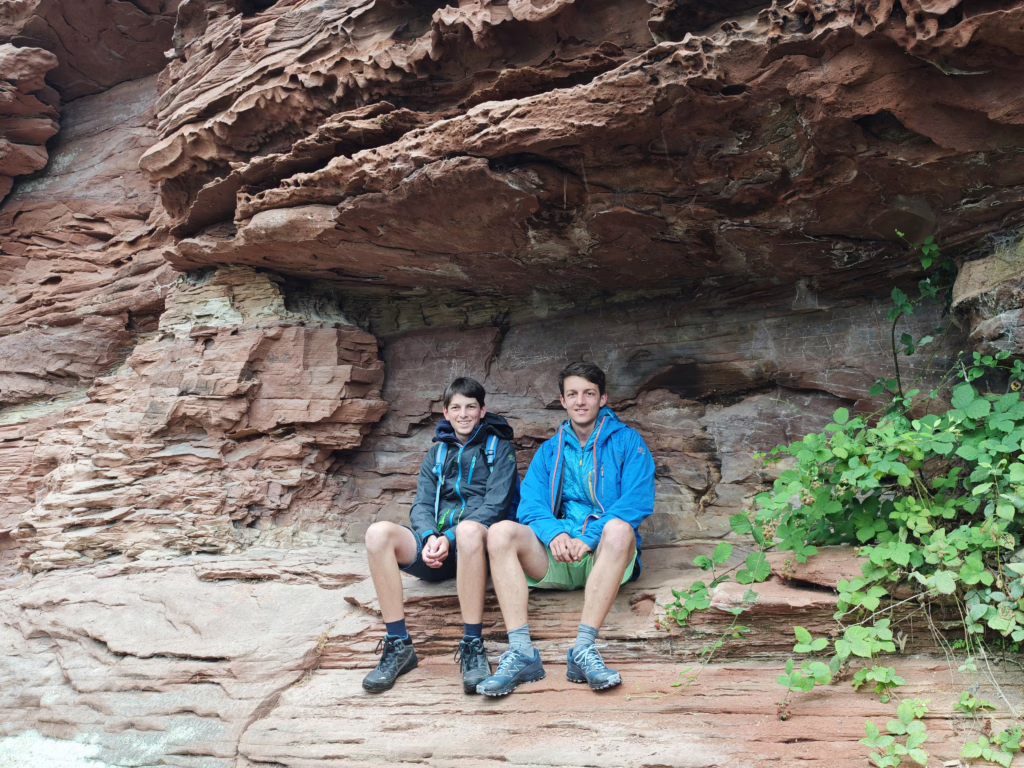 Ein Stück ging es den Weg nun zurück, um dann weiter zum Geisenfelsen zu gelangen. Hier kann man auf den Felsen draufgehen, bevor es weitergeht. Kurz haben wir ein Wohngebiet gestreift, bevor wir das Mordloch erreicht haben. Der Weg schlängelt sich hier kurz zwischen halbhohen Felsen hindurch, bevor man weitergeht. Zu guter Letzt sind wir noch an der kleinen, halboffenen Höhle, der Philippsruhe, vorbeigewandert und dann waren wir auch schon wieder am Eisweiher. Für die ganze Runde haben wir inkl. Pausen 4,5 Stunden gebraucht, wobei unsere Teenager mittlerweile sehr schnell wandern. Die Tour hat uns mit den Felsen sehr gut gefallen, die Wegstücke durch den Wald ziehen sich teilweise etwas.