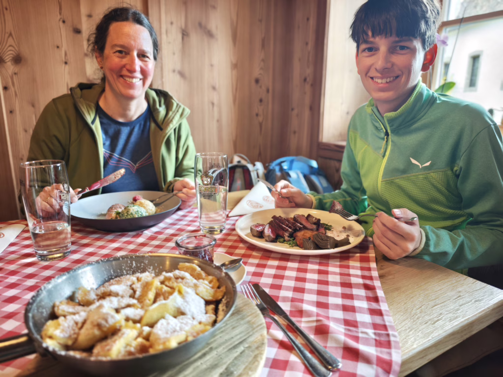 Der urige Gasthof ist ein echter Geheimtipp für kulinarischen Genuss. Sitzen kann man in der neuen oder der historischen Gaststube oder bei schönem Wetter auf der Sonnenterrasse. Serviert werden typische Südtiroler Speisen auf gehobenem Niveau. Wir haben von der Speisekarte probiert: Knödeltris (drei verschiedene Knödel) in Butter mit Parmesan, Tagliata vom Rind (fein geschnittene Rinderfiletscheiben) mit Kartoffelrösti und Artischocke und einen köstlichen Kaiserschmarrn mit handgepflückten Preiselbeeren aus der Region. Uns hat es hervorragend geschmeckt. Und zum Trinken gab es für uns nach der Wanderung eine Apfelschorle mit Apfelsaft direkt vom Hof. Sehr lecker und erfrischend!