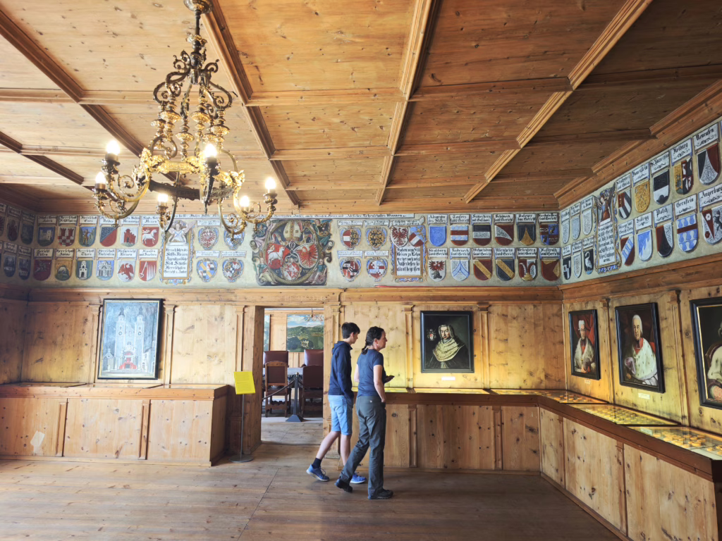 Los geht es hier bei einem schönen Kreuzgang (ähnlich wie der in Brixen) mit Fresken und tollen gotischen Kreuzgewölben. Ein echter Gegensatz dazu ist die Kirche, die wie der Dom in Brixen sehr üppig ausgestattet ist, doch fast noch mehr als der Dom. Denn der Sakralraum ist verschwenderisch im Rokoko-Stil ausgeschmückt. Im eigentlichen Museum dreht sich in den ersten Räumen alles um kirchliche Kunst aus dem Mittelalter und der frühen Neuzeit. Du kannst dir hierfür einen Audioguide (siehe Infokasten) herunterladen. Dieser Teil war für uns persönlich nicht ganz so spannend. Dafür haben wir uns dann ausführlicher die alten Karten im Wissenschaftsraum angeschaut, wo auch Globen aller Art zu sehen sind.
