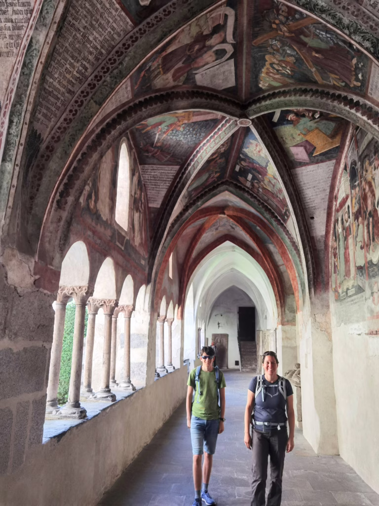 Rechts neben dem Dom ist der Kreuzgang. Dieser ist sehr sehenswert. Er ist romanisch-gotisch und somit wesentlich schlichter. Uns hat er aber fast noch mehr beeindruckt. Der Kreuzgang hat an den Wänden und den Decken viele ziemlich gut erhaltene Fresken. Die dienten früher den Menschen als eine Art Bilderbuch. Denn die wenigsten konnten lesen. Und so sind die biblischen Geschichten hier aufgemalt worden. Es lohnt sich auf jeden Fall, etwas genauer hinzuschauen. Wir haben zwischen den Fresken auch eine Darstellung von einem Elefanten entdeckt bzw. das, was sich der Maler damals unter einem Elefanten vorgestellt hat. Es sieht doch eher aus wie ein Pferd mit überlangem Rüssel 🙂 .