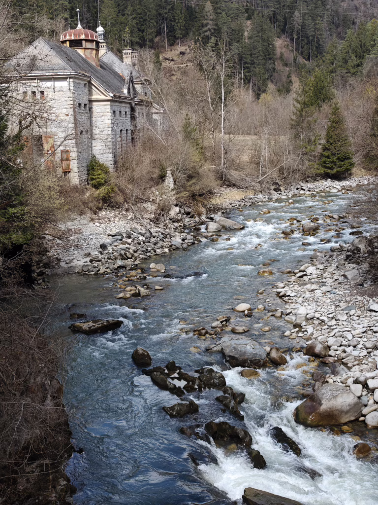 Kurz oberhalb der Rienz steht das alte Elektrizitätswerk, und das schaut fast aus wie ein altes, verwunschenes Schloss. Eigentlich sind es zwei Gebäude. Am oberen, halb eingefallenen Gebäude kommt man automatisch vorbei. Hier gibt es auch eine Infotafel. Etwas weiter unten, schon halb zugewachsen, steht dann das herrschaftliche – leider auch schon sehr verfallene – Hauptgebäude. Beide Gebäude wirken sehr einsturzgefährdet, aber von außen sind sie auch eindrucksvoll. Ein paar Meter dahinter fließt die Rienz in ihrem tiefen Bachbett. Die Rundlbrücke führt an dieser Stelle über den Fluss. Von der überdachten Holzbrücke hat man schöne Blicke in die wilde Schlucht.
